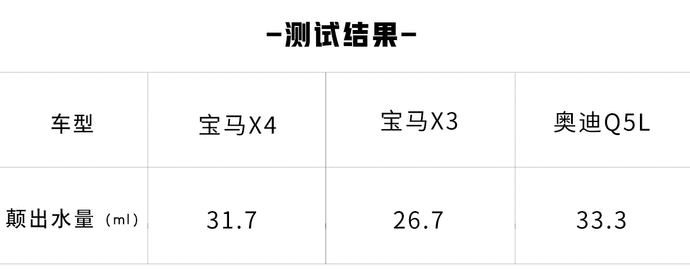 经过三组测试,宝马X4平均颠出的水量为31.7ml,从这个成绩来看,它的表现还是十分出色的。虽然不及宝马X3的水平,但对比主打舒适性的奥迪Q5L来看,X4也依旧存在着一定的优势。实际驾驶中可以感觉到,尽管X4的底盘采用的是偏运动的调校,但是对于路面的细碎颠簸还是能够起到一定的过滤作用,在面对一些比较大的颠簸时,底盘也能表现出比较好的韧性,使传递到身体上的振颤不会显的过于突兀,同时这套悬挂对于车身多余的振动也能起到比较好的抑制作用。