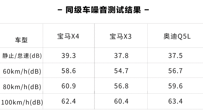 对比同级别的两台豪华品牌SUV,可以看到宝马X4在静音性上的整体表现还是不错的,虽然不如自家的X3,但对比奥迪Q5L除了在怠速时有一定差距之外,其它时速下还是比较接近的。